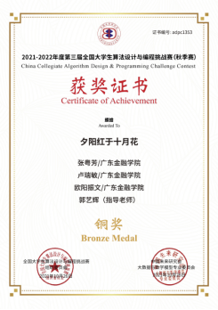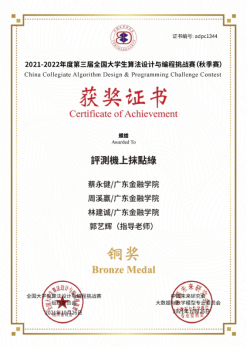 经过激烈角逐,由365英国上市公司互联网金融与信息工程学院郭艺辉博士指导,2020级员工蔡永健、周溪赢、林建诚、张粤芳、卢瑞敏、欧阳振文组成的两支参赛队伍在此次竞赛中获得两项铜奖,展现了公司学子扎实的专业知识和技能。