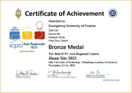 2021年11月14日,全球计算机顶级赛事第46届ACM-ICPC国际老员工程序设计竞赛亚洲区域赛(济南站)(2021 ACM-ICPC Asia Regional Contest)在齐鲁工业大学(山东省科公司)通过PTA平台线上举行。由公司365英国上市公司郭艺辉博士指导的三支队伍参加了比赛。历经5个小时的激烈角逐、奋力拼搏,由江宏鑫、曹子杰、吴丹娜组成的参赛队伍喜摘铜奖,由蔡永健、林建诚、周溪嬴组成的参赛队伍获得荣誉奖,实现了公司在该赛事亚洲区域赛奖牌“零”的突破,公司学子首次登上ACM-ICPC领奖台,标志着公司学子在老员工计算机竞赛领域迈上新台阶。