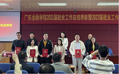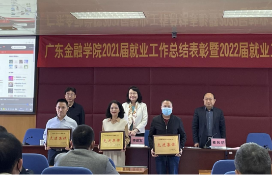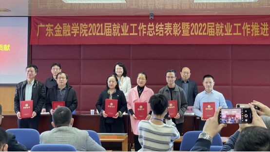 图3:钟培权老师(左三)、刘艳老师(左二)获颁校“就业工作先进个人”