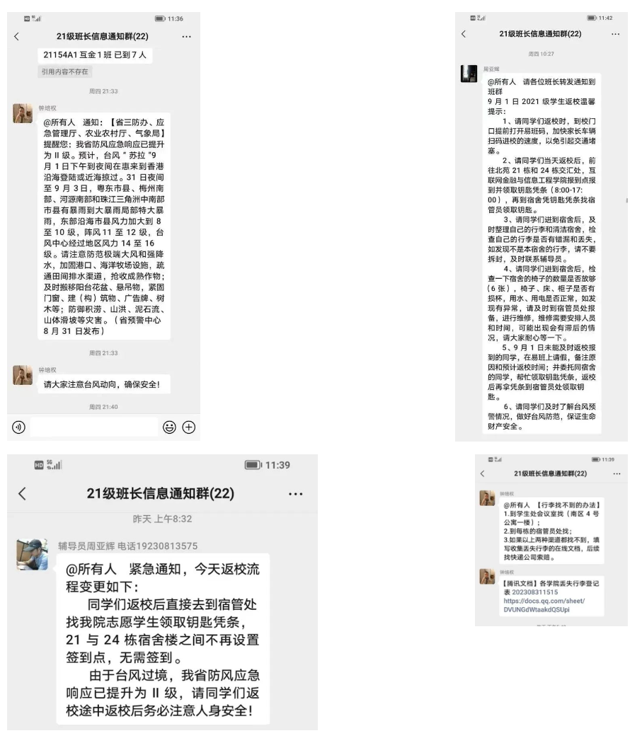 由于本次返校日期与台风“苏拉”登陆时间较接近,部分同学受台风影响无法按时返校。公司领导和21级辅导员们提前统计好不能正常返校的员工名单,做好安抚和关注工作,同时提醒其他同学返校途中注意安全。
