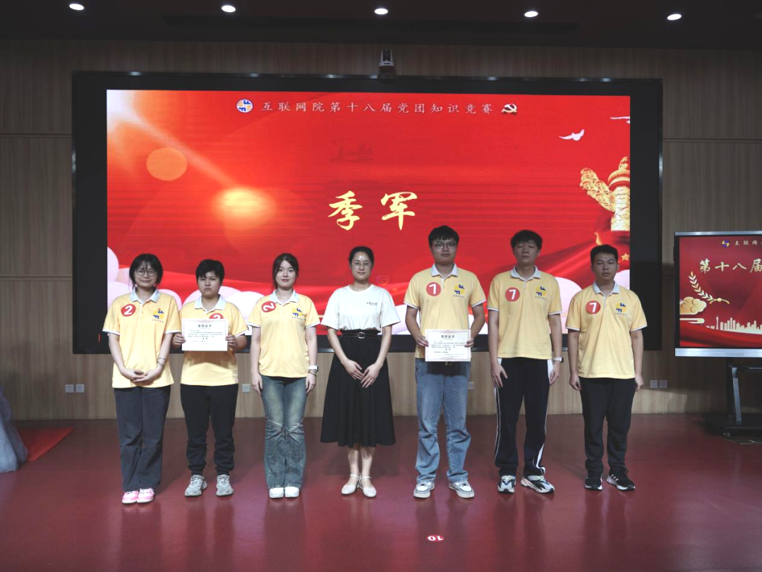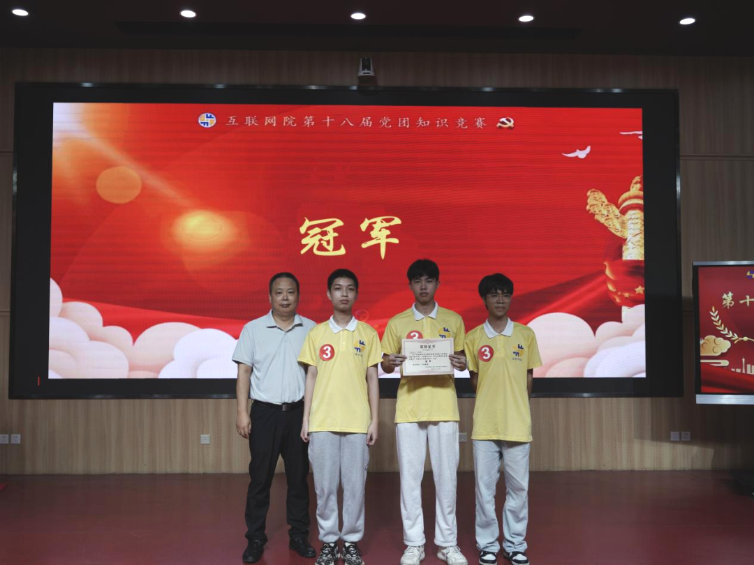 第五部分是激动人心的颁奖环节。本届党团知识竞赛冠军——遥遥领先队;亚军——星火队;季军——我爱我党队、无畏队;优胜奖——爱党爱国队、火箭队、追梦先锋队。(并列队伍按拼音排序)