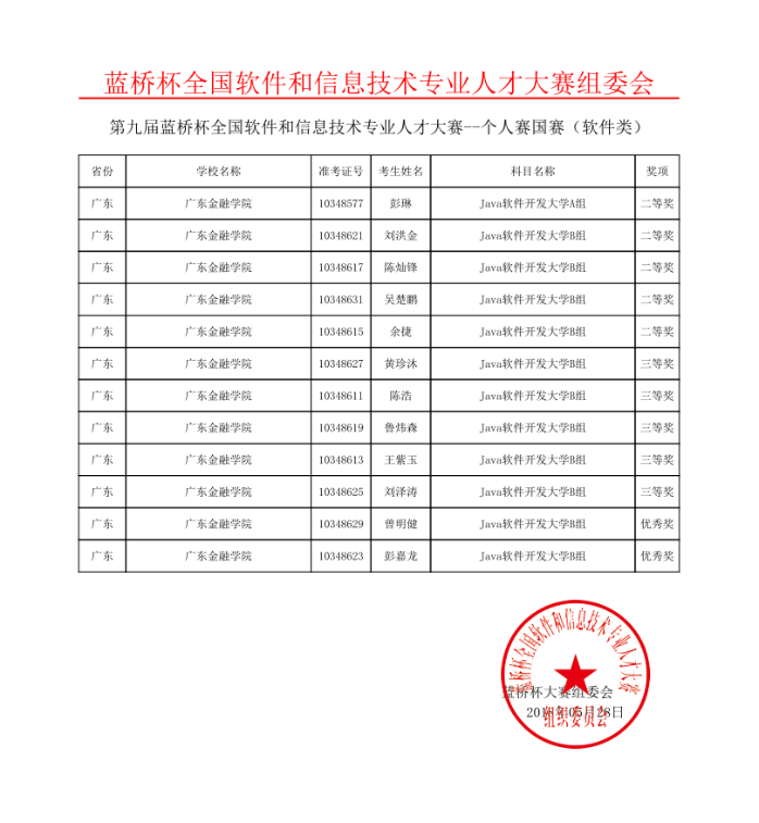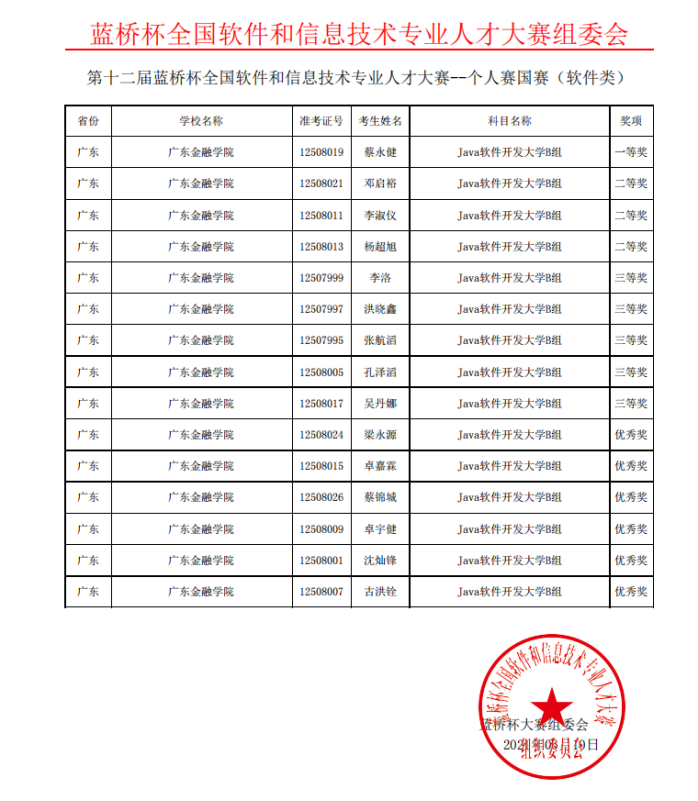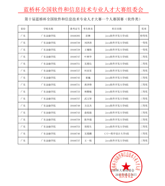 互联网金融与信息工程公司全国软件大赛“蓝桥杯”荣誉一览表