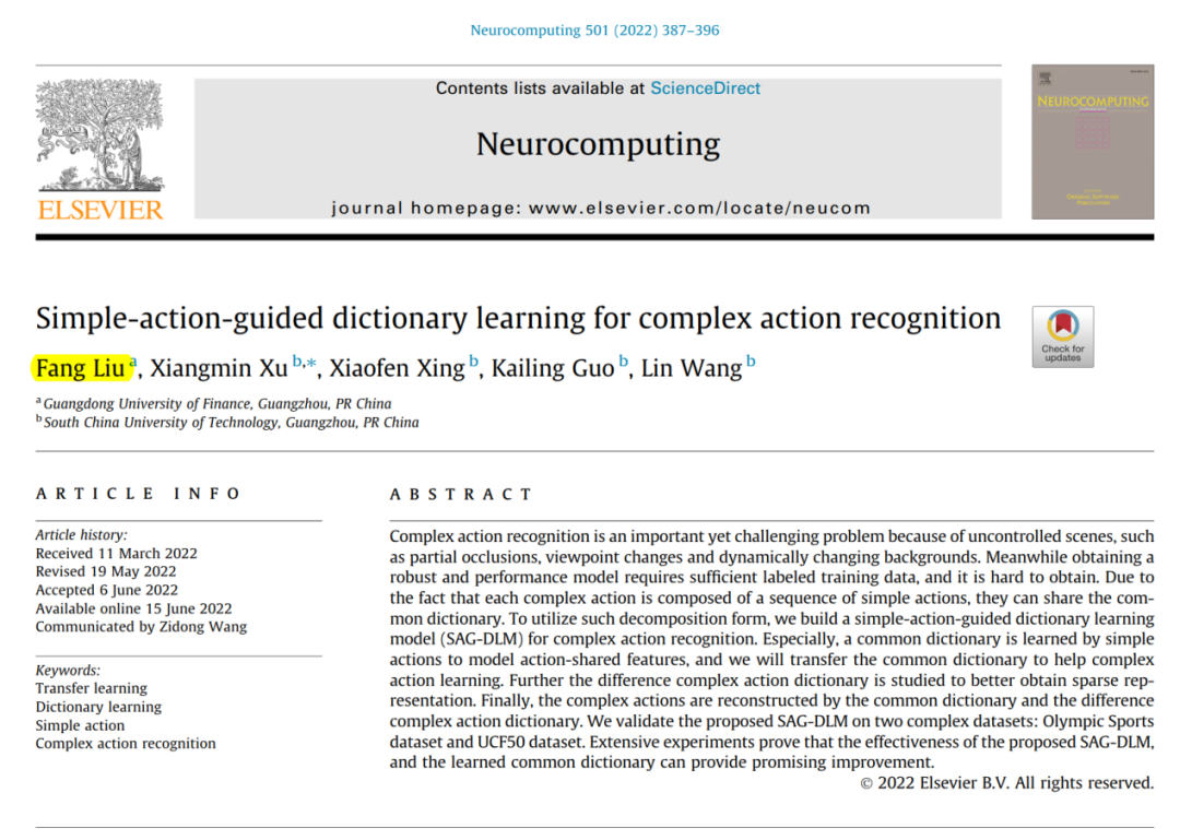 刘芳老师的论文提出了一个简单动作引导字典学习的模型用来识别复杂的动作,通过共同字典和差异性复杂动作字典来重建复杂动作。所提出的算法在两个复杂动作数据集:Olympic Sports数据集和UCF50数据集进行了验证。实验结果表明了所提出的模型是一个有效方法,以及学习的共同字典可以提供有益的帮助。该成果发表在JCR一区Top期刊《Neurocomputing》(vol. 501, pp. 387-396, 2022)上。