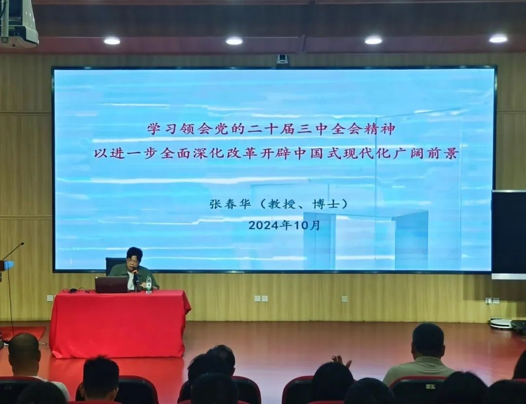 党课由马克思主义公司教授张春华主讲,张春华教授以《学习领会党的二十届三中全会精神 以进一步全面深化改革开辟中国式现代化广阔前景》为题,从党的二十届三中全会(决定)的文本比较、主要内容、以高质量发展全面推进中国式现代化、教育工作者推动中国式现代化的使命担当等四个方面领学了全会精神。课程内容脉络清晰、切合实际,语言生动形象、深入浅出,课程引导大家准确把握了本次全会在中国改革开放进程和中国现代化进程中的历史方位,深刻领会全会主题和重大意义。